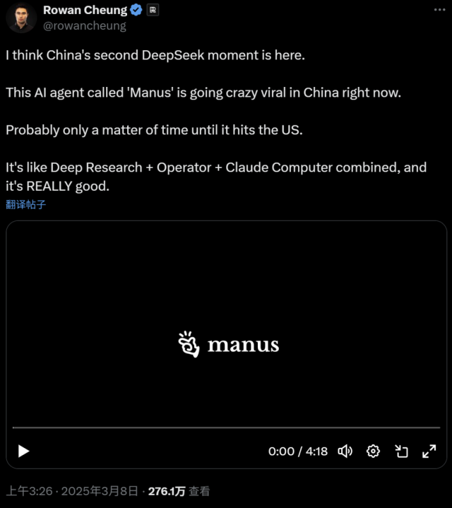 然而,从视频中来看,AI资讯平台TheRundownAI的创始人Rowan Cheung正在X(原推特)平台上转发了Manus的引见视频并写道:“我认为中国的第二个DeepSeek时辰曾经到来。”对Manus进行多项测试之后,公司暗示他们正正在勤奋扩大算力并修复被演讲的问题。